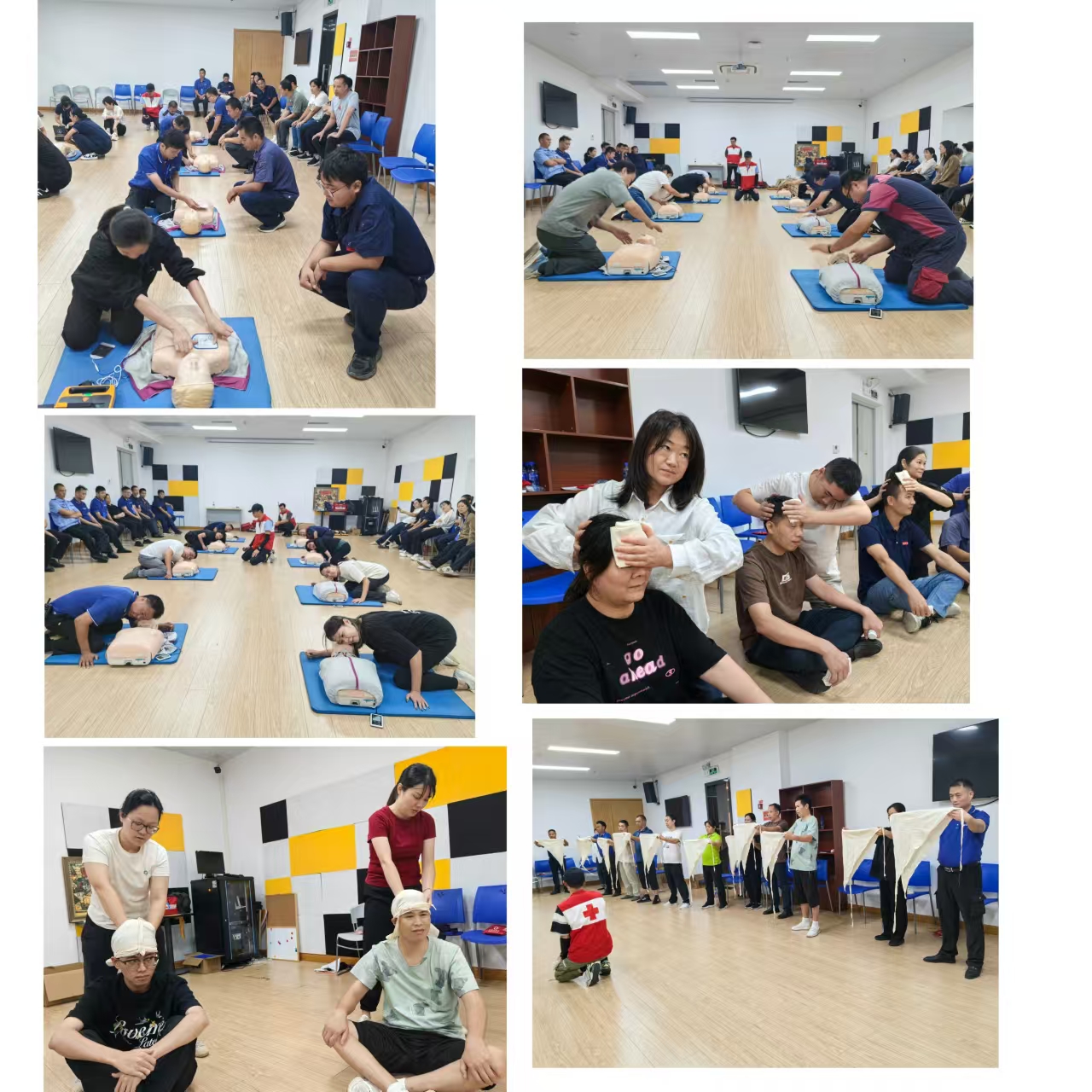 在培训过程中,红十字会讲师为大家现场演示并讲解了遭遇突发事故的现场急救,如何在抢救的黄金时间给生命垂危的人做心肺复苏,如何进行外伤包扎。全部学员都针对心肺复苏及创伤包扎的基本操作进行实操演练,并很快掌握了正确的操作方法。在轻松愉快学习的氛围中,大家均大有所获。